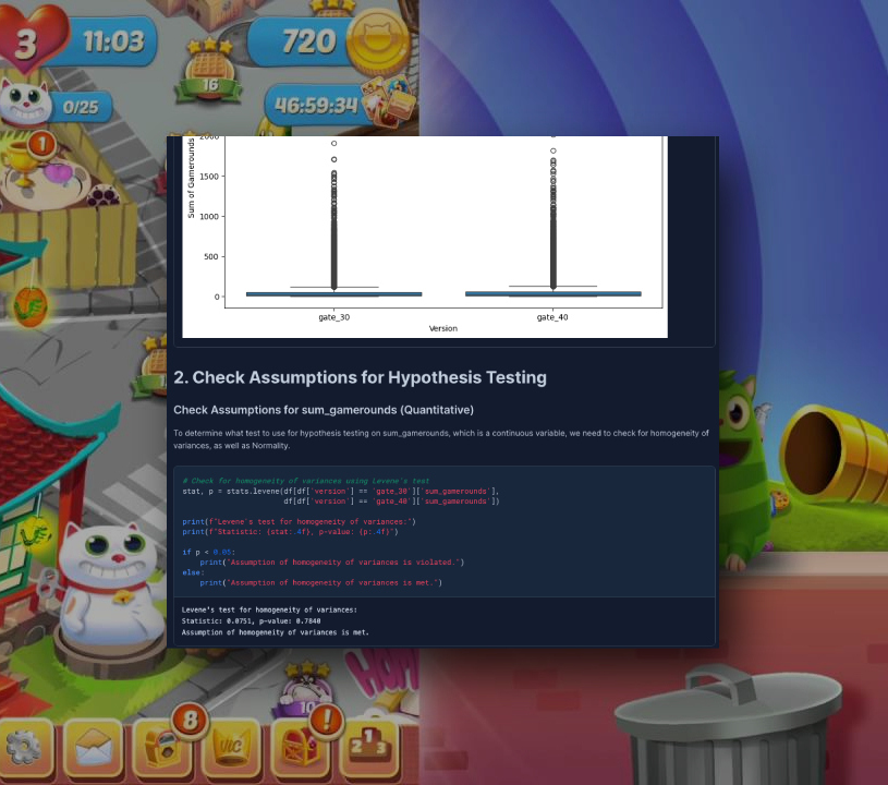 Analyzed a large-scale A/B test for the mobile game 'Cookie Cats' using Python, measuring the impact of moving an in-game gate (level 30 → 40) on player retention and engagement.