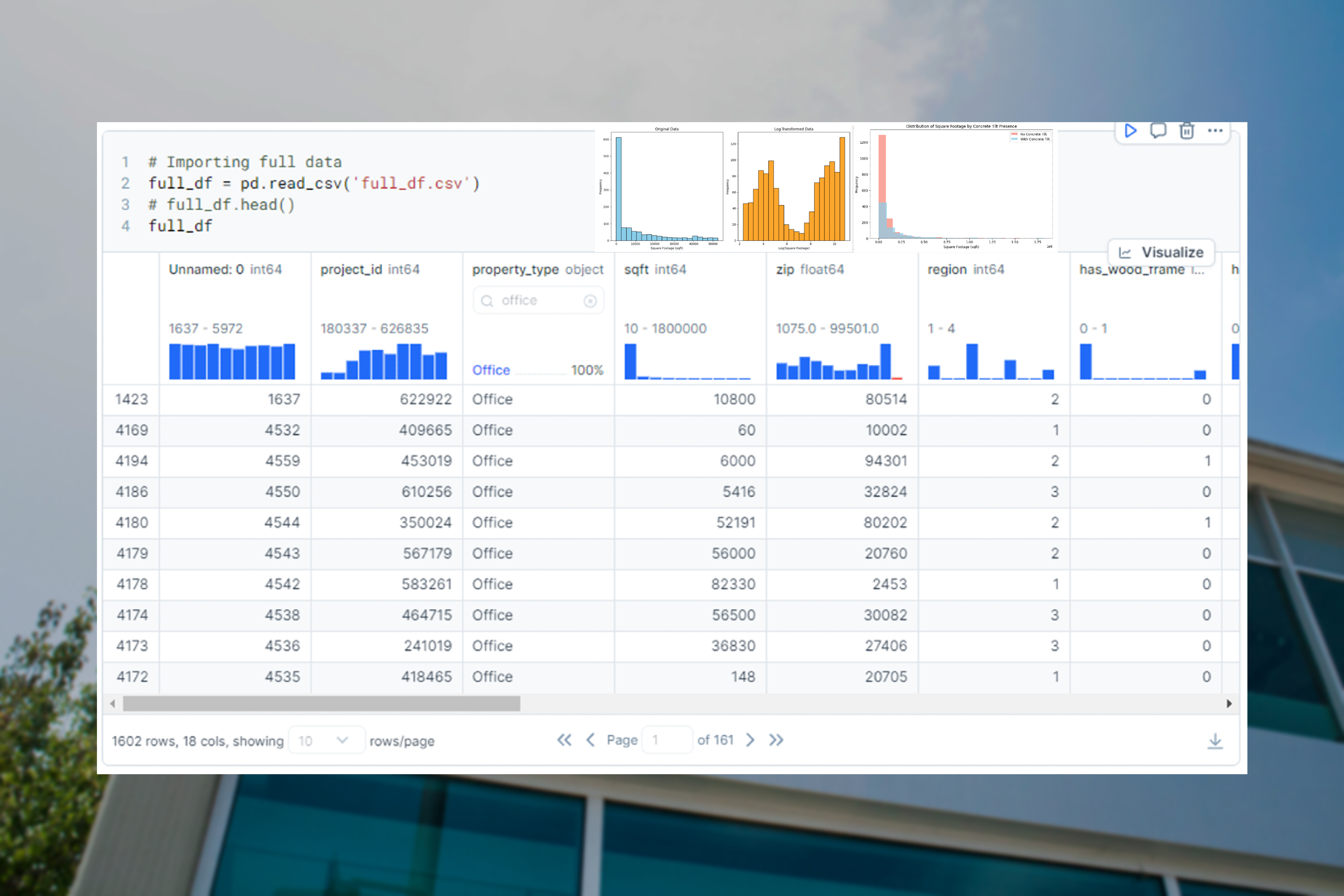 Data cleaning and wrangling on a proprietary dataset provided by Partner Engineering, containing millions of data points on various commercial real estate properties. Transformations were made to the dataset to prepare it for data analysis, where correlations between structural attributes was explored and evaluated as potential inputs to the machine learning model.