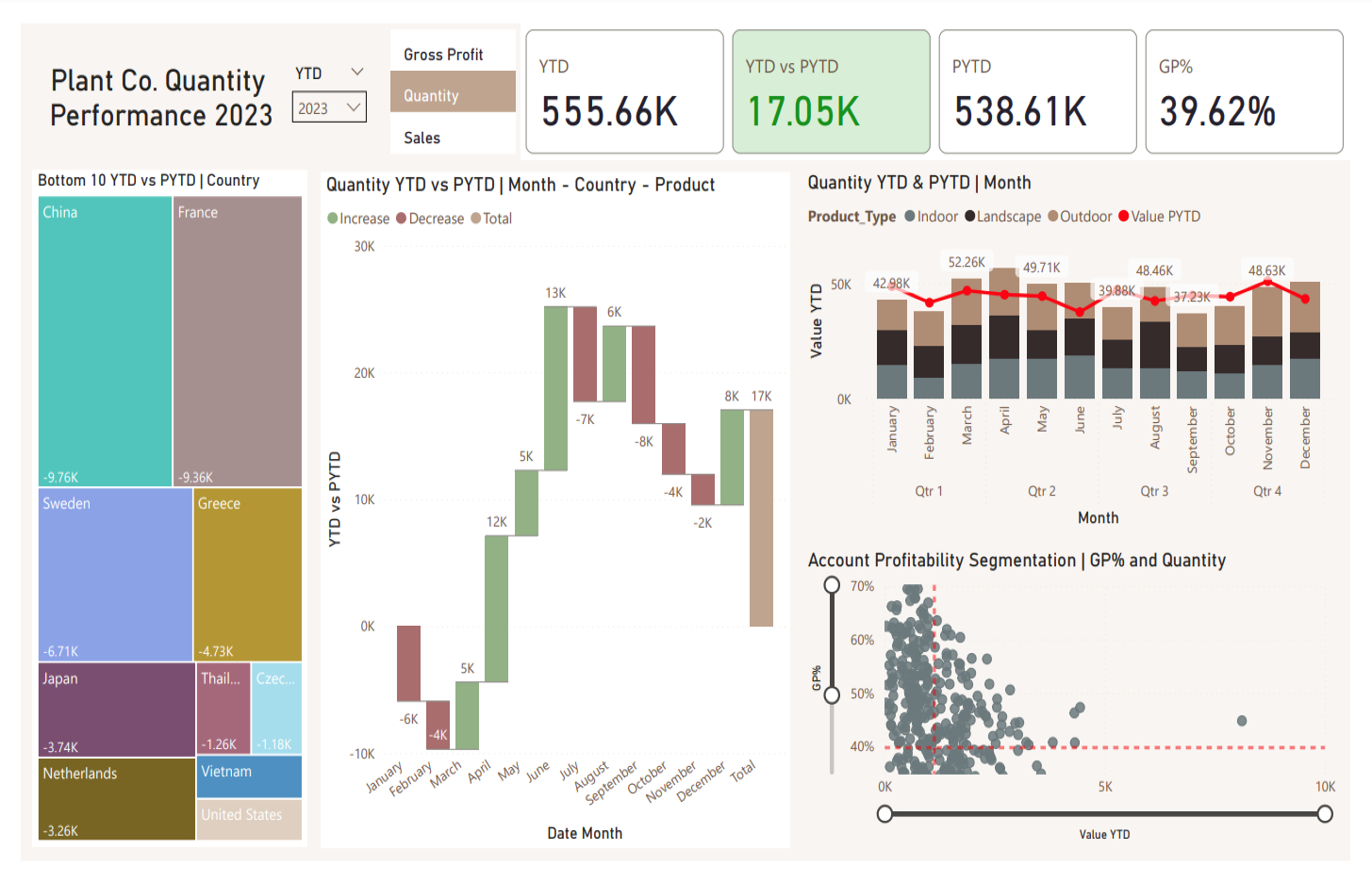 Building an interactive dashboard that would allow executives to track product quantity performance across different countries and time periods. The dashboard provides both high-level KPIs and the ability to drill down into specific areas of concern.