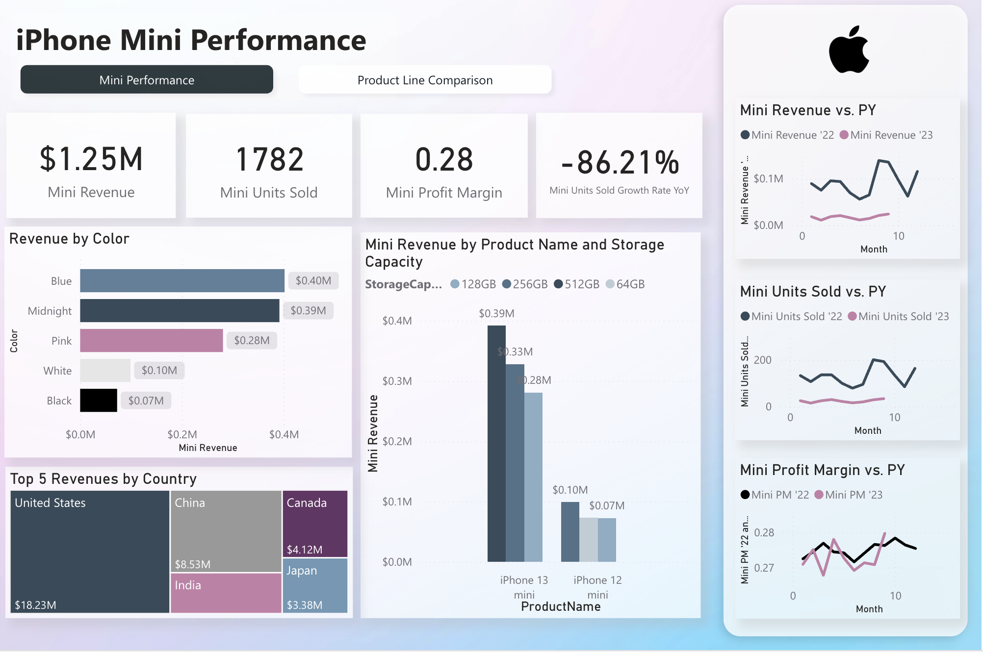 Dashboard to help executives answer a fundamental question: “Is it worth continuing the iPhone Mini line?” Balances high-level KPIs with the ability to compare across product lines, drill into time trends, and examine product attributes such as color, storage, and geography.
