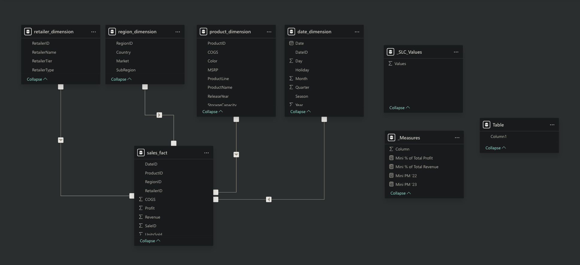 - Fact table (Sales): revenue, profit, COGS, units sold