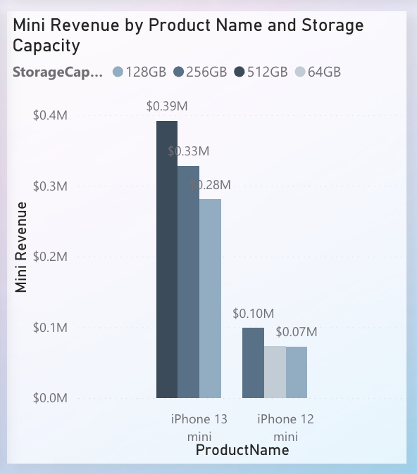 - Bar Chart – Revenue by Model & Storage: Breaks out iPhone 12 Mini vs. iPhone 13 Mini across storage capacities (64GB, 128GB, etc.), highlighting SKU-level variation.