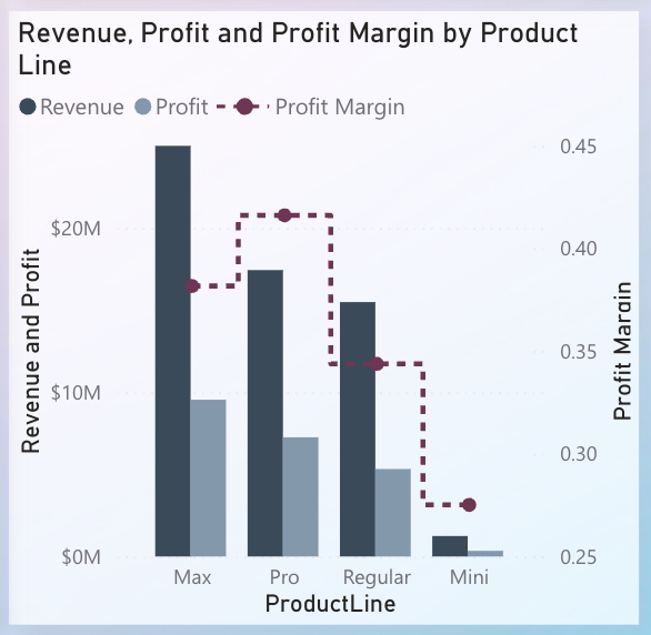 - Clustered Bar + Dot Chart: Bars show revenue & profit for each product line (Max, Pro, Regular, Mini), while dots overlay margin % for each line on a secondary axis. This avoids scale confusion and highlights how Mini underperforms both in scale and margin.