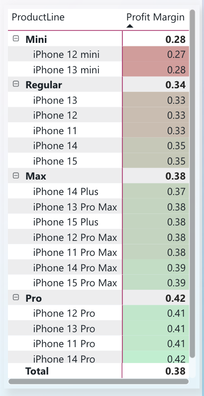 - Matrix of Models by Margin: A narrow tabular reference showing margin % across all SKUs. Conditional formatting makes Mini’s consistently lower values stand out.