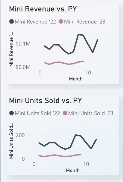 - Consistent Filters: Both pages share slicers, allowing apples-to-apples comparisons between Mini and overall lines.