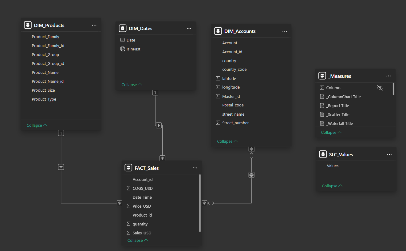 The initial data exploration revealed a classic star schema opportunity, with the Sales Facts table at the center connected to the three dimension tables.