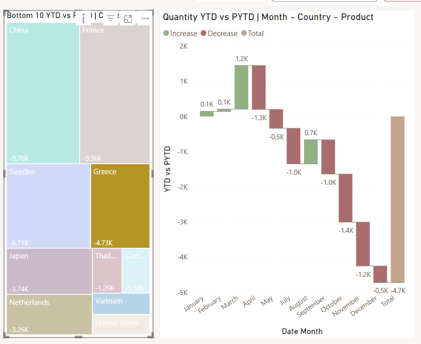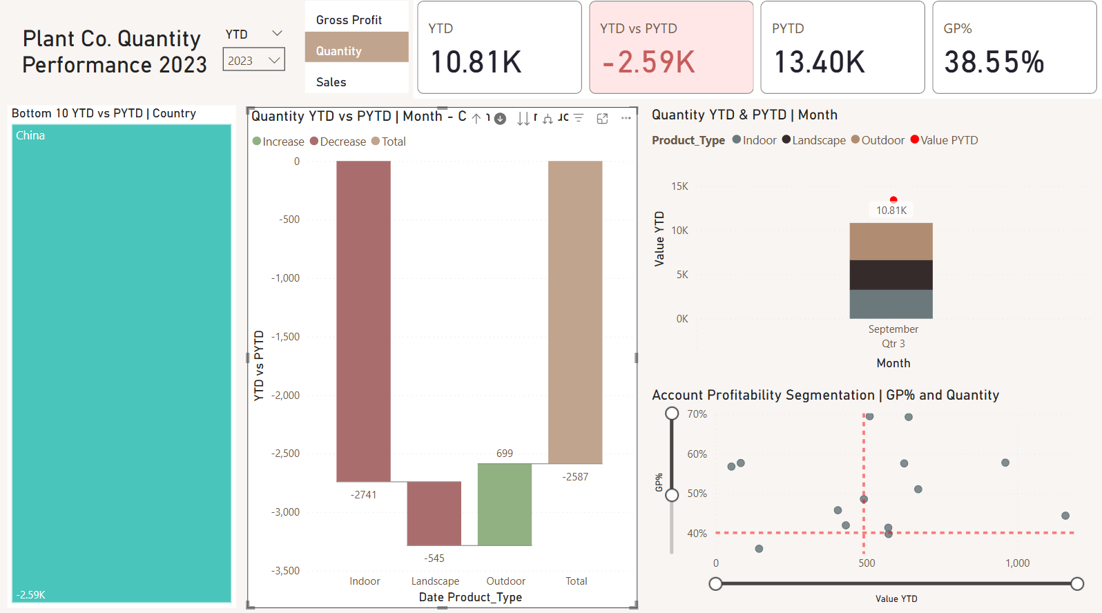 The goal was to build an interactive dashboard that would allow Plant Co. executives to track product quantity performance across different countries and time periods. The dashboard needed to provide both high-level KPIs and the ability to drill down into specific areas of concern.